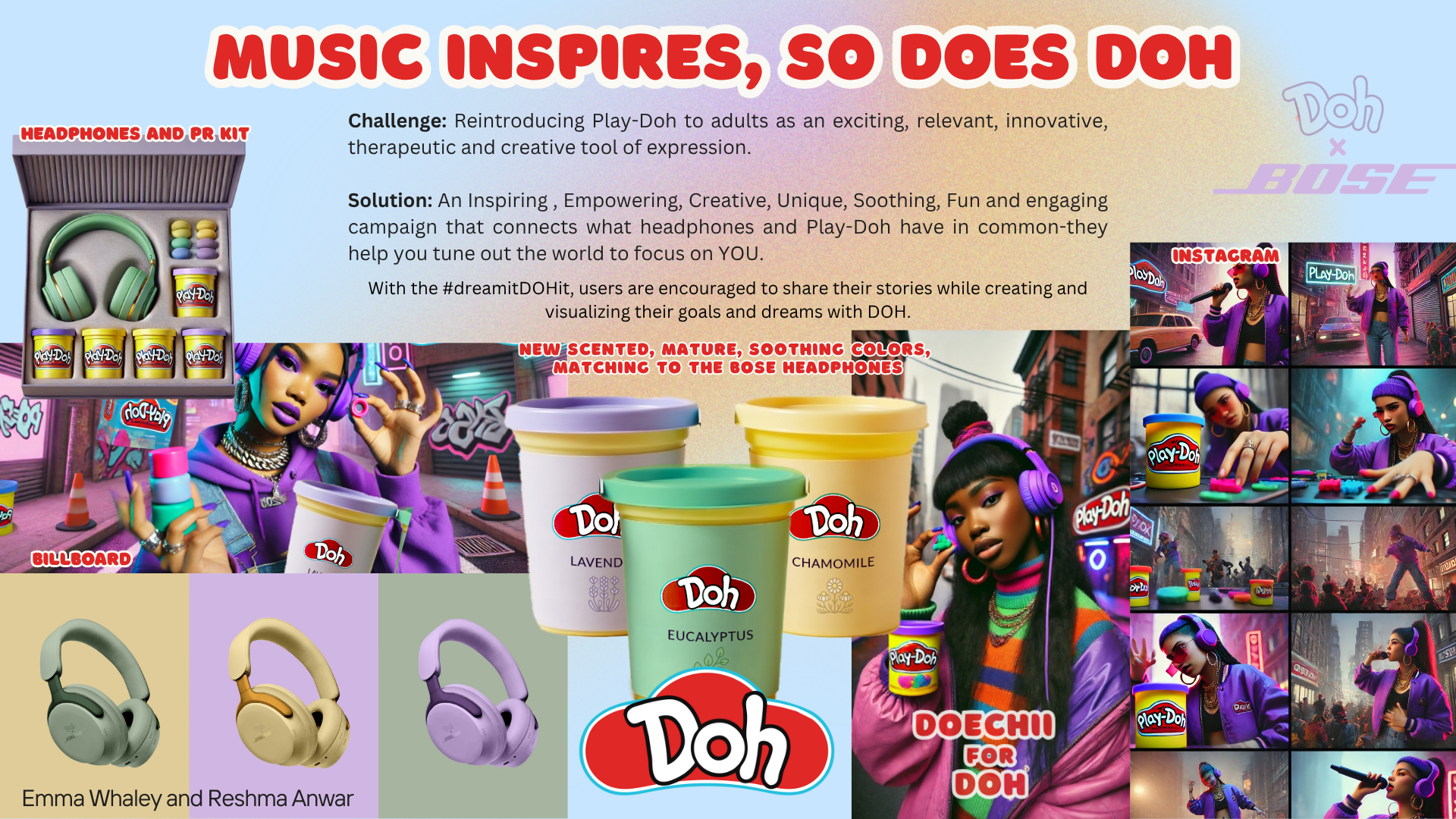 The campaign uses play-doh as an innovative tool for visualization and dream realization. It invites adults to feel inspired and creatively express themselves, while releasing the every-day hustle. That creative expression is manifested in its collaboration BOSE x DOH x Doechii with an exclusive song collaboration featuring DOH and the headphones, which are available in three colors and scents—Lavender, Eucalyptus, Chamomile—for calmness and relaxation. Removing “play” rebrands Doh for a broader audience, emphasizing its use for creativity, relaxation, and therapy, appealing to adults as a versatile tool for all ages.