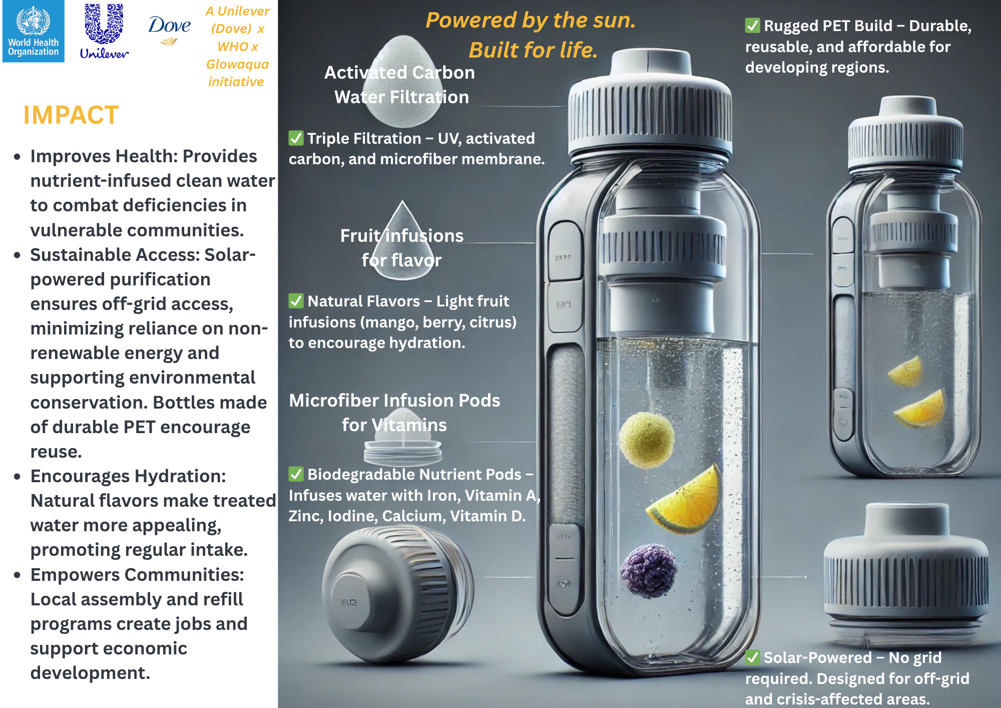Introducing a groundbreaking reusable, durable, portable, solar-powered water purification bottle that not only disinfects and purifies unsafe water, but also infuses it with essential vitamins, minerals, electrolytes, and natural flavors via biodegradable capsules to address common deficiencies and improve hydration in developing regions, while also offering a sustainable and eco-friendly solution to global water contamination challenges.